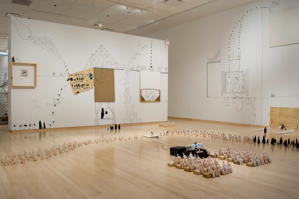 MFA Thesis Exhibition Installation: india ink wall drawings, drawings on canvas, paper, and papyrus with India ink and acrylic, white stoneware figurines, video projection. Temple Gallery, Philadelphia, USA 2009