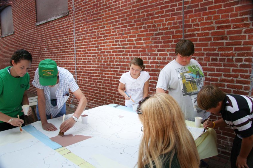 Waiting for the Reading and Columbia Train mural, 2009 Published January 19, 2013 at 3456 × 2304 in Mural titled Waiting for the Reading and Columbia Train, 2009 Starting to color the tiles.
