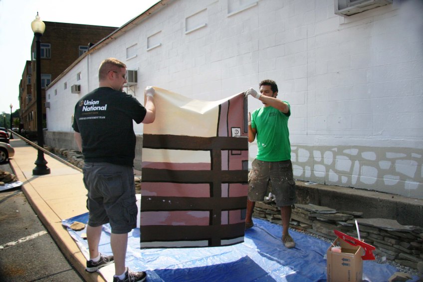 Waiting for the Reading and Columbia Train mural, 2009 Published January 19, 2013 at 3456 × 2304 in Mural titled Waiting for the Reading and Columbia Train, 2009 Preparing to put the first tile of fabric in place.