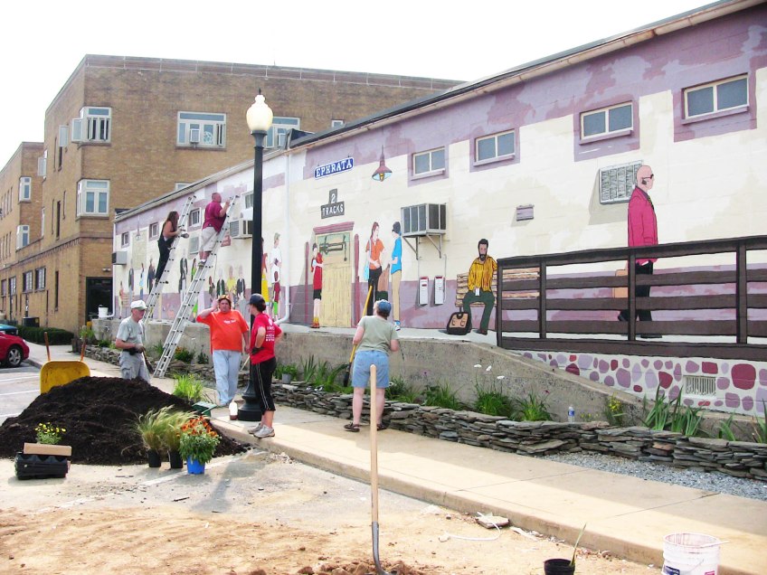 Waiting for the Reading and Columbia Train mural, 2009 Published January 19, 2013 at 2048 × 1536 in Mural titled Waiting for the Reading and Columbia Train, 2009 Almost done.