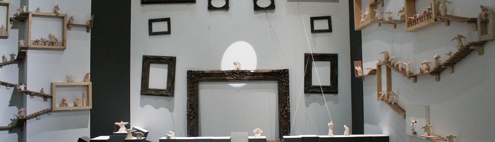 Mixed-media installation (fired clay, wood, and ready made frames).