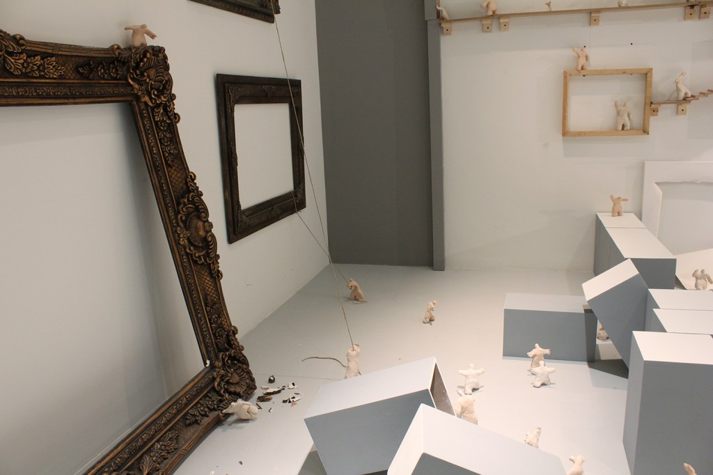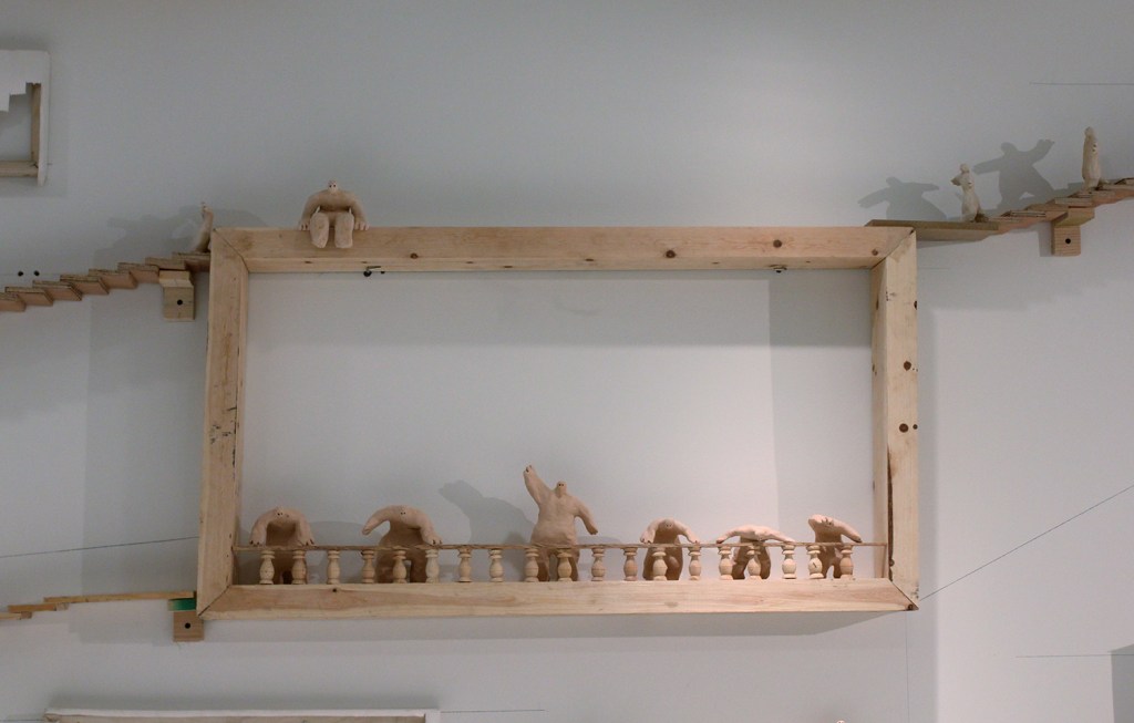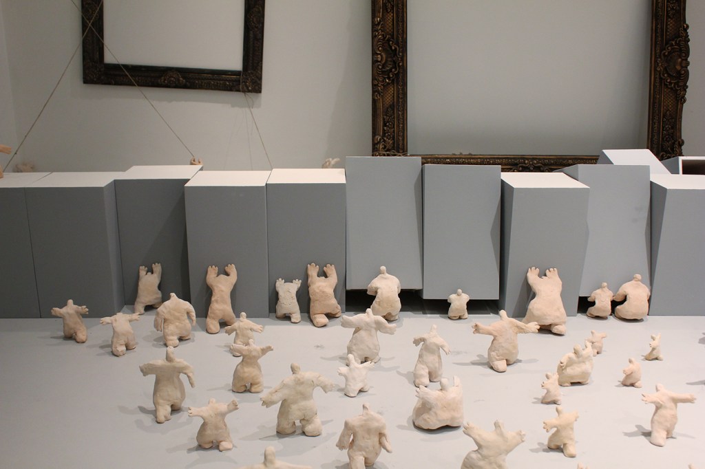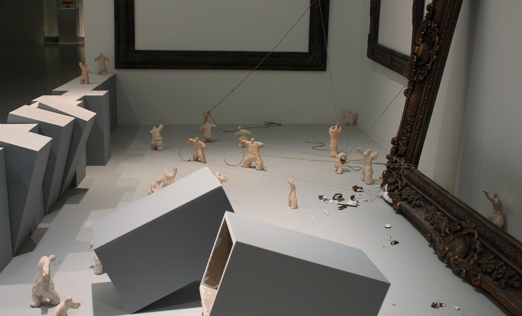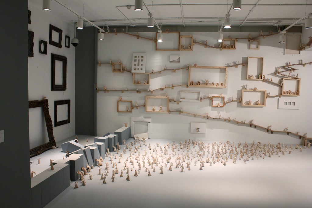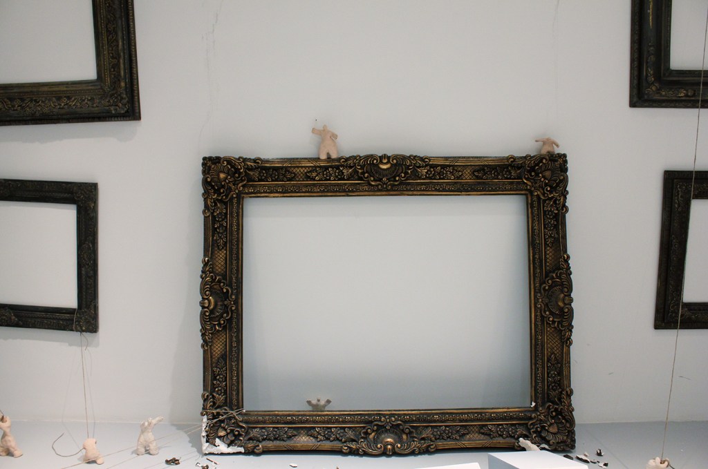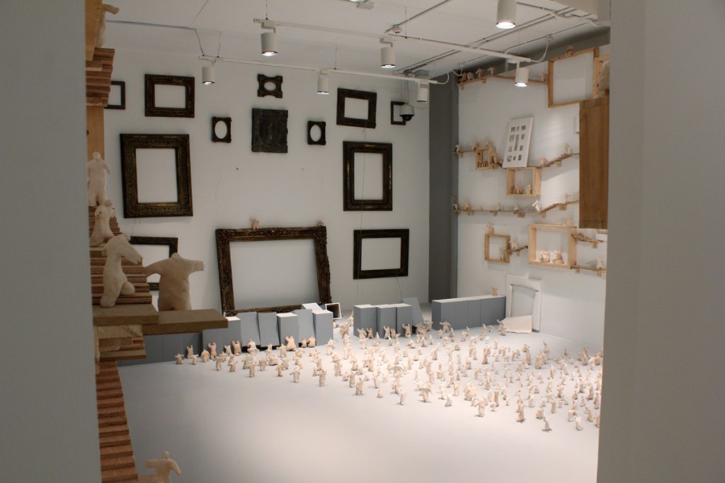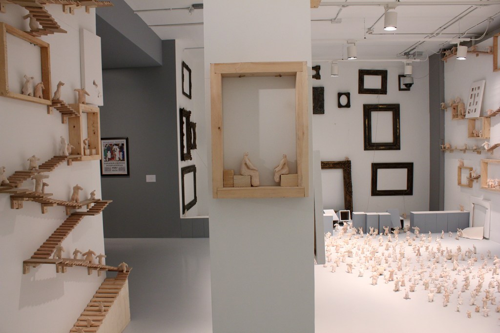 Mixed-media installation (fired clay, wood, and ready made frames). Tea with Nefertiti exhibition, curated by Sam Bardaouil and Till Fellrath. Commissioned by Mathaf: the Arab Museum of Modern Art in Doha, Qatar, 2012.