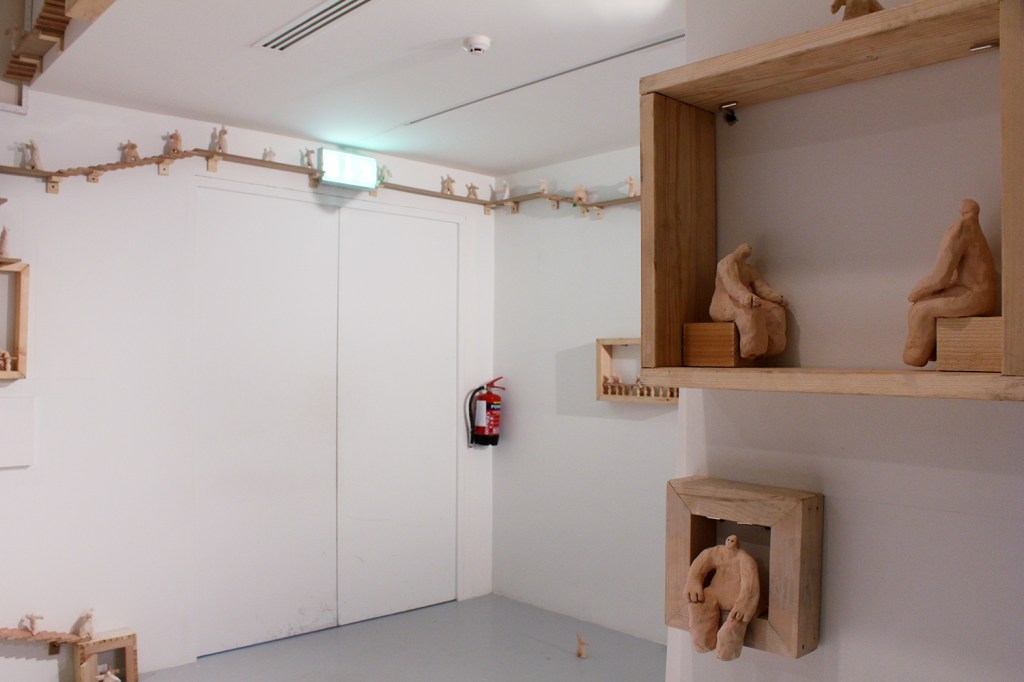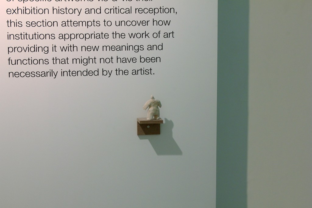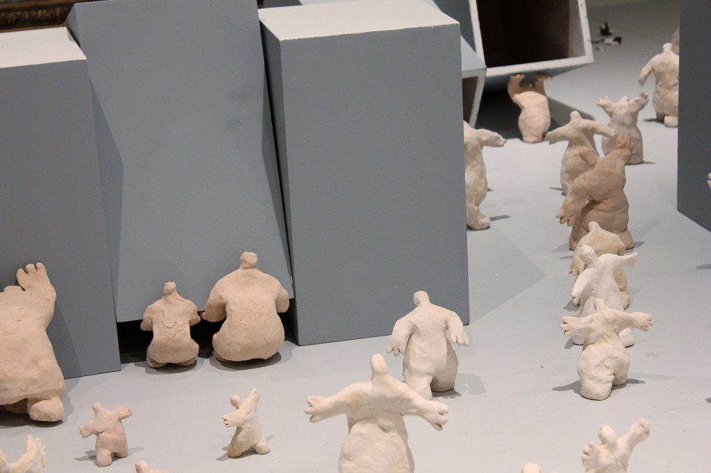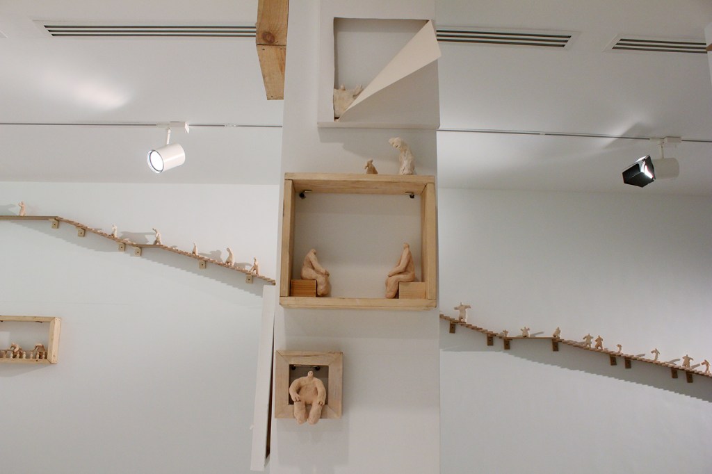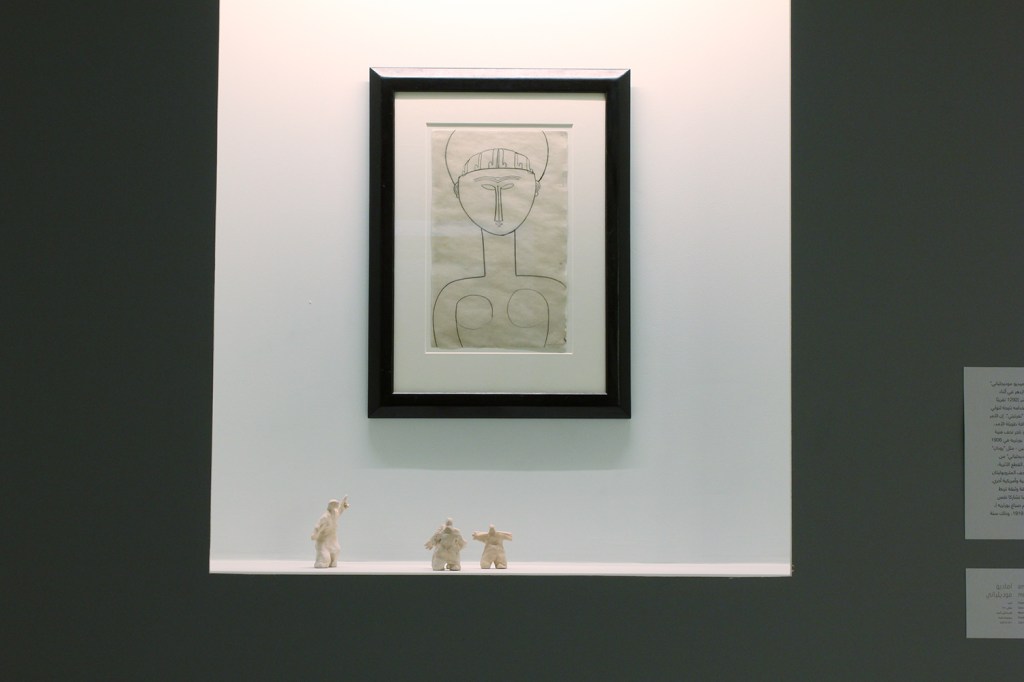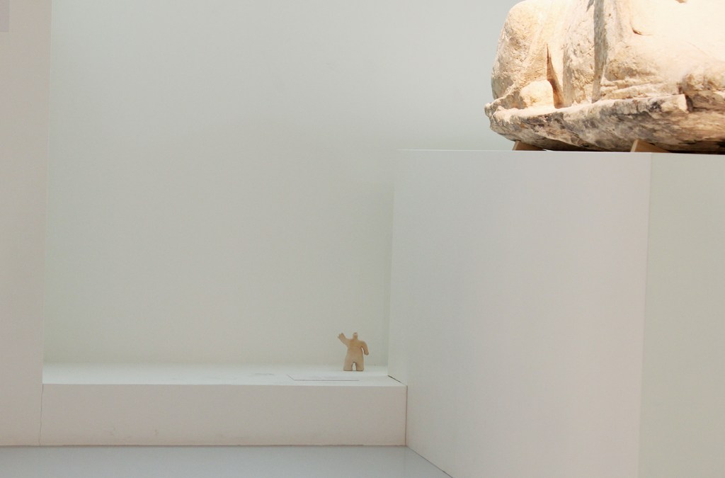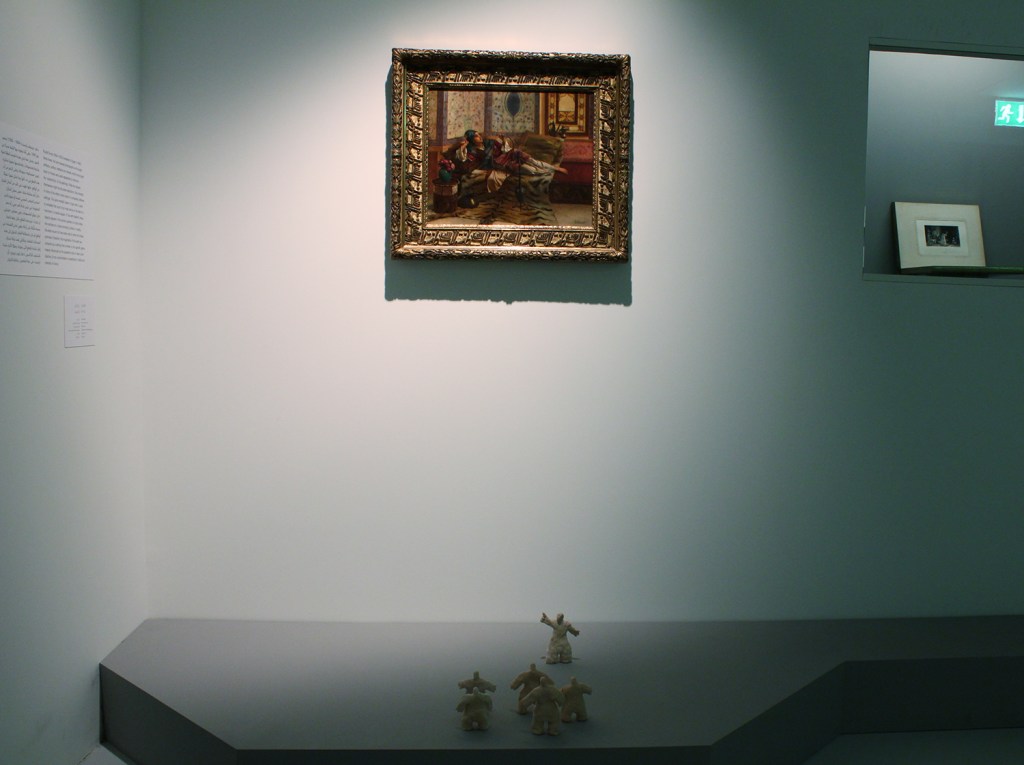 Curatorial note, by Sam Bardaouil and Till Fellrath: “Bassem Yousri’s mixed media installation is meant as a critical voice of dissent that emanates from within the exhibition itself. Yousri’s characters that are dispersed across the museum galleries participate in the act of looking while, at the same time, questioning the thematic notions, juxtapositions, and semantics that are proposed by the curators. They engage with the artworks and the mechanisms by which they are displayed (plinths, pedestals, vitrines, etc.) at times in consent, and at others in acts of disobedience, that seek to topple the museological paradigms by which they operate. They also surround the viewers from every corner scrutinising their every move and mimicking the way they respond to the displays. Yousri’s figures, and different forms of intervention permeate the museum forming a thread that connects the exhibition’s various iterations.”