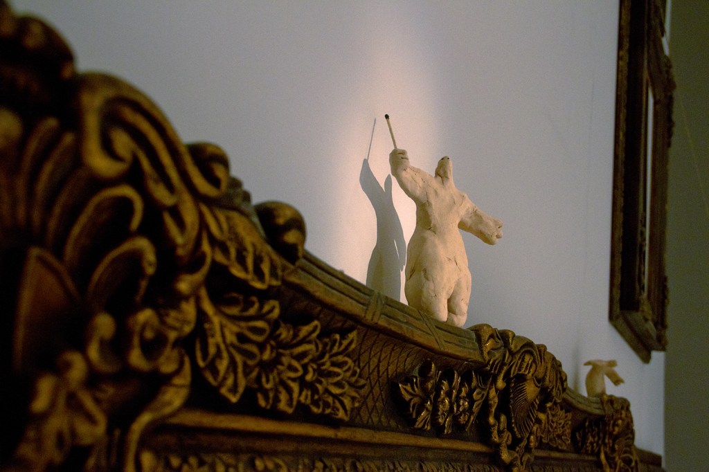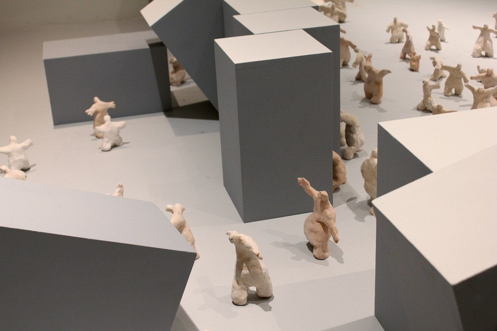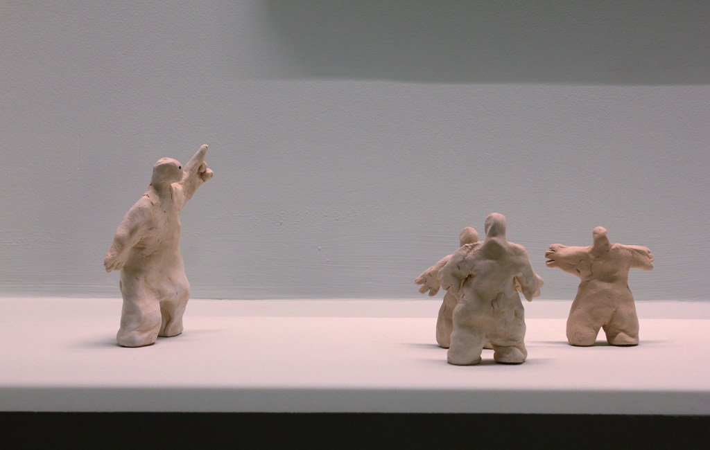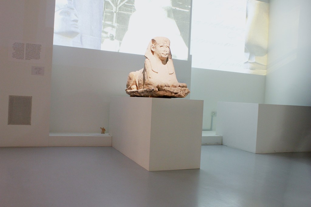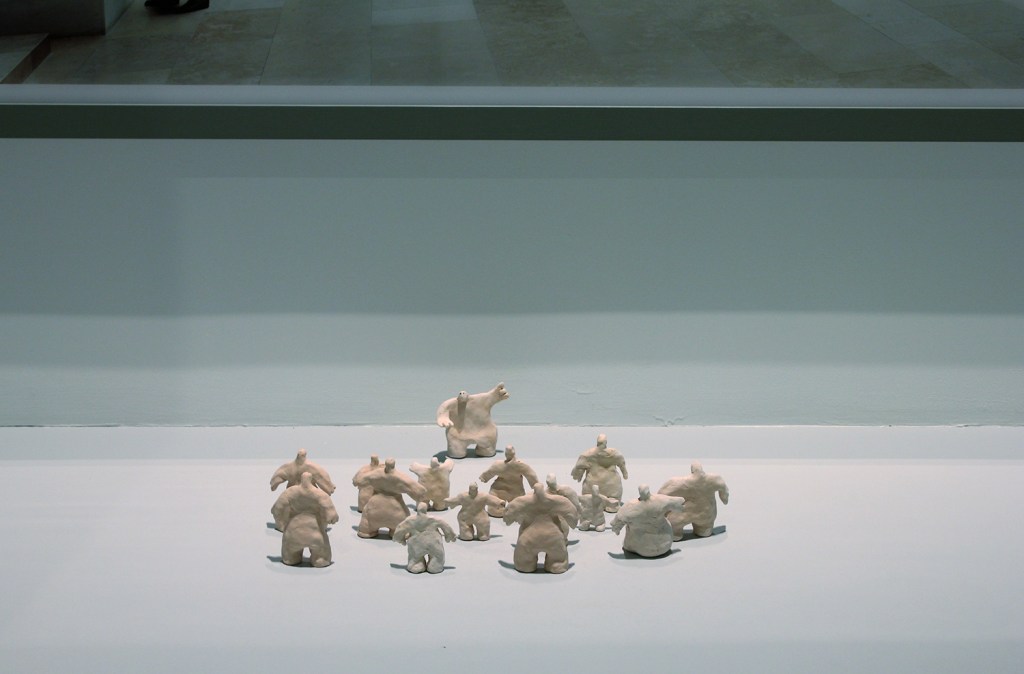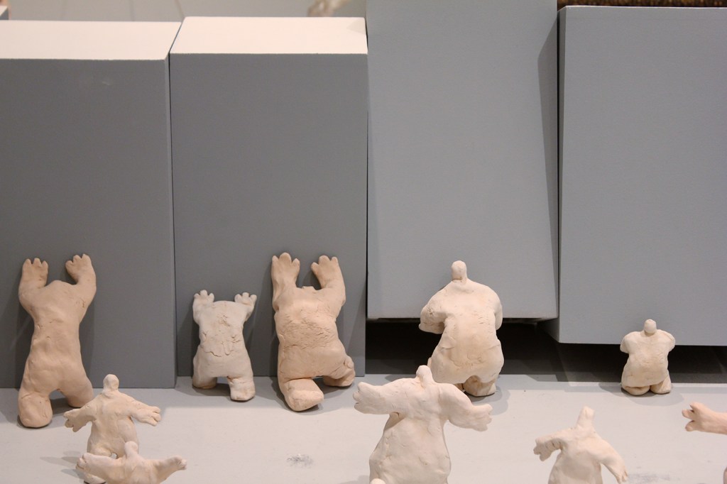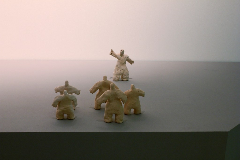 Curatorial note, by Sam Bardaouil and Till Fellrath: “Bassem Yousri’s mixed media installation is meant as a critical voice of dissent that emanates from within the exhibition itself. Yousri’s characters that are dispersed across the museum galleries participate in the act of looking while, at the same time, questioning the thematic notions, juxtapositions, and semantics that are proposed by the curators. They engage with the artworks and the mechanisms by which they are displayed (plinths, pedestals, vitrines, etc.) at times in consent, and at others in acts of disobedience, that seek to topple the museological paradigms by which they operate. They also surround the viewers from every corner scrutinising their every move and mimicking the way they respond to the displays. Yousri’s figures, and different forms of intervention permeate the museum forming a thread that connects the exhibition’s various iterations.”