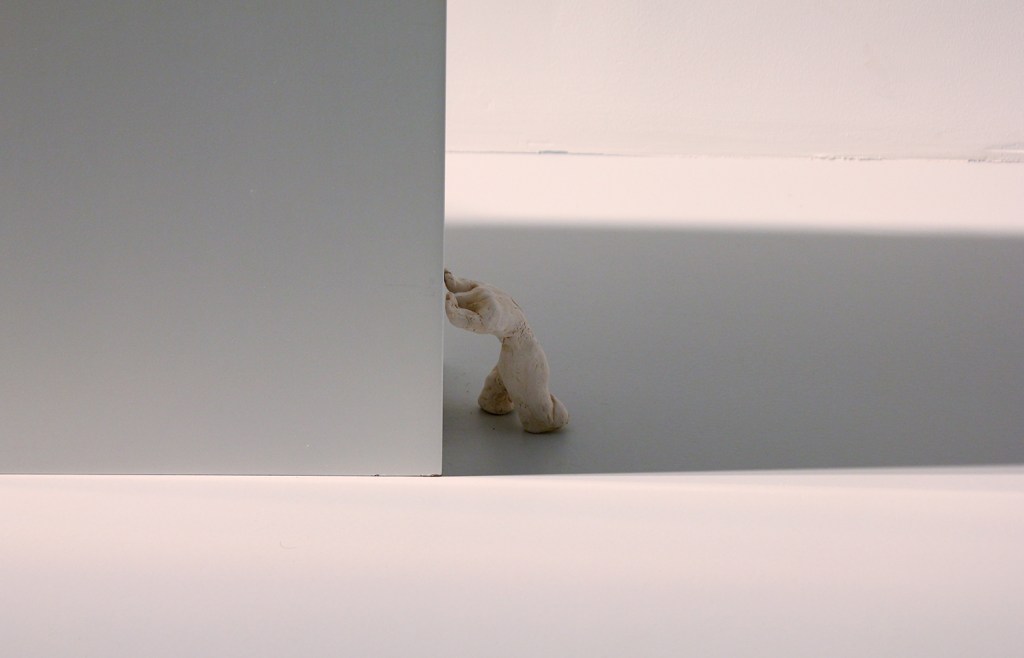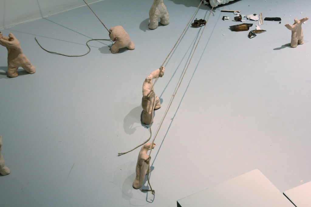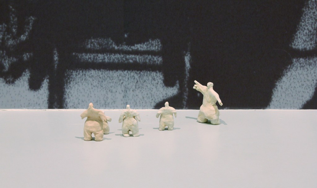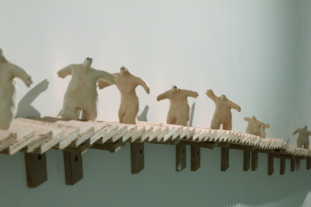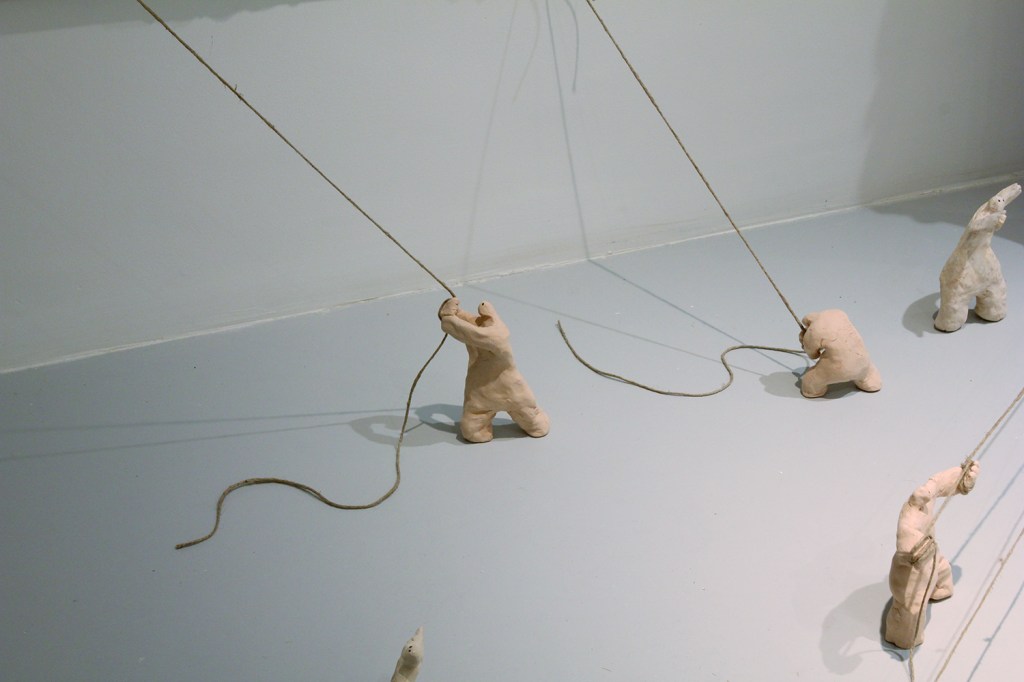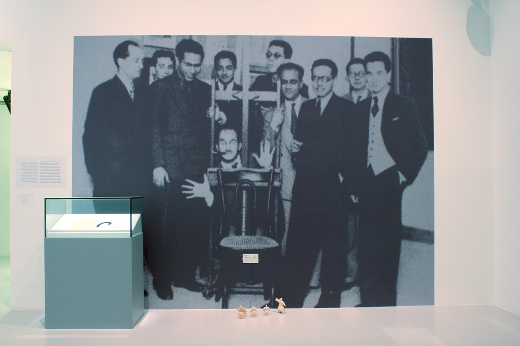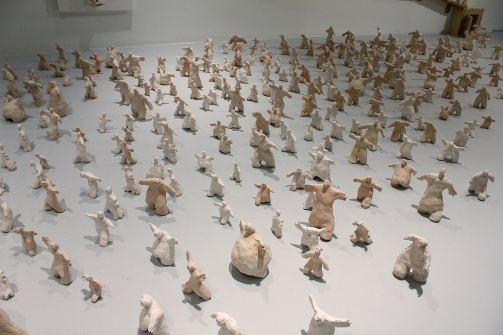 Curatorial note, by Sam Bardaouil and Till Fellrath: “Bassem Yousri’s mixed media installation is meant as a critical voice of dissent that emanates from within the exhibition itself. Yousri’s characters that are dispersed across the museum galleries participate in the act of looking while, at the same time, questioning the thematic notions, juxtapositions, and semantics that are proposed by the curators. They engage with the artworks and the mechanisms by which they are displayed (plinths, pedestals, vitrines, etc.) at times in consent, and at others in acts of disobedience, that seek to topple the museological paradigms by which they operate. They also surround the viewers from every corner scrutinising their every move and mimicking the way they respond to the displays. Yousri’s figures, and different forms of intervention permeate the museum forming a thread that connects the exhibition’s various iterations.”