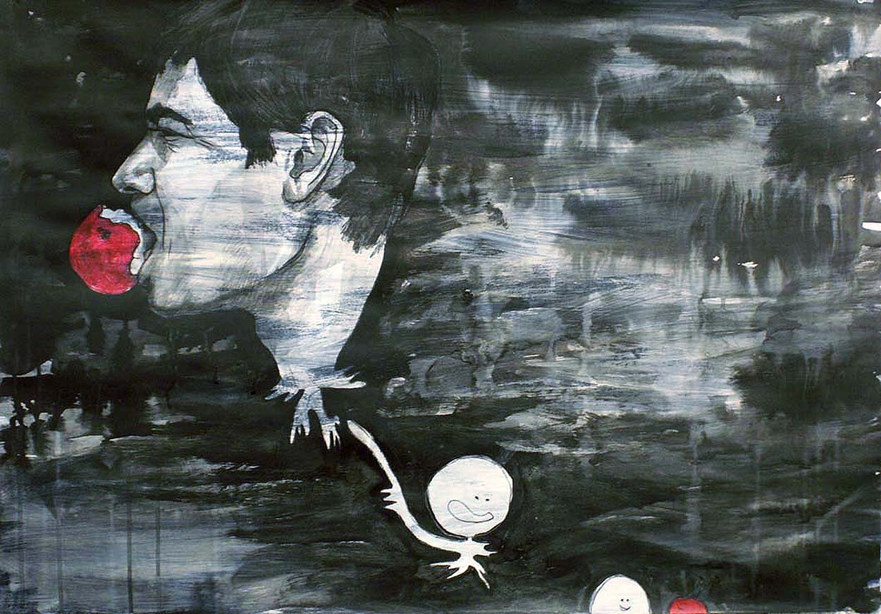 A Man Eating an Apple Published February 28, 2013 at 1250 × 872 in Paintings and Drawings, 2007 – 2008 Acrylic, India ink, and charcoal on paper, 55 cm x 110 cm, 2007.