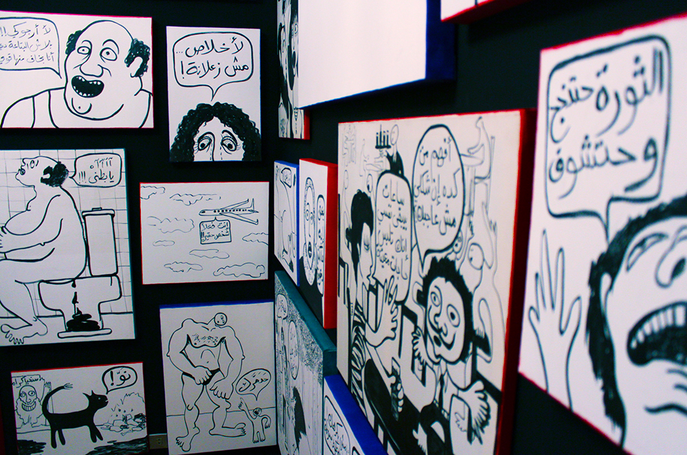 This installation represents what could be perceived as a huge non-linear storyboard or graphic novel. The “narrative” is the result of a random arrangement of small instances, taken out of their context, that are inspired by life events at times, and at other times are completely fictional. The scenes portrayed on the canvases introduce a commentary on society, politics, and religious taboos in a light-hearted and sarcastic way.
