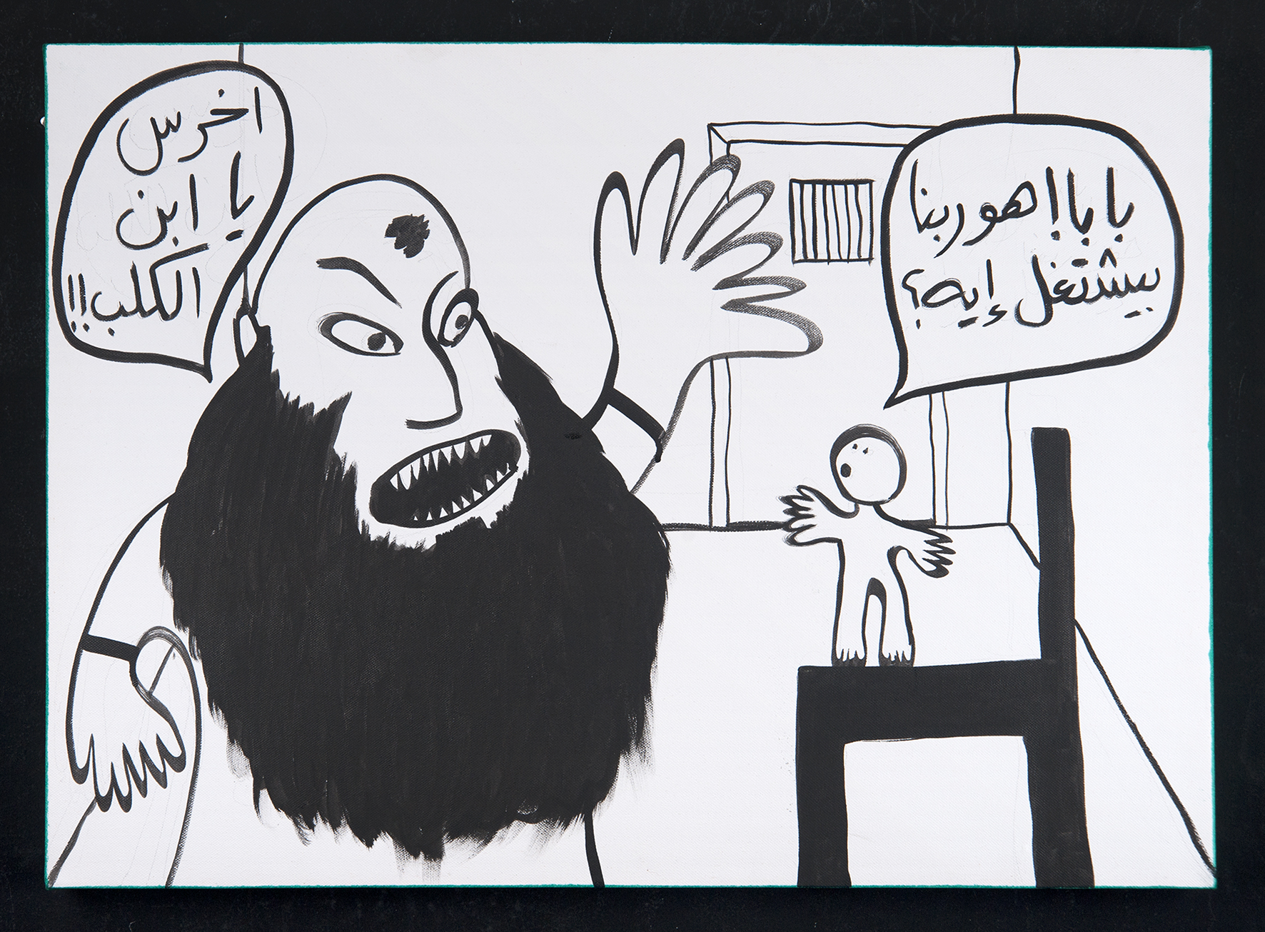 Published August 18, 2016 at 1772 × 1305 in RGB (1) – Kid: “Dad, what does God do for a living?” – Man: “Shut up, you son of a bitch!” India ink and acrylic paint on canvas 70 cm X 50 cm