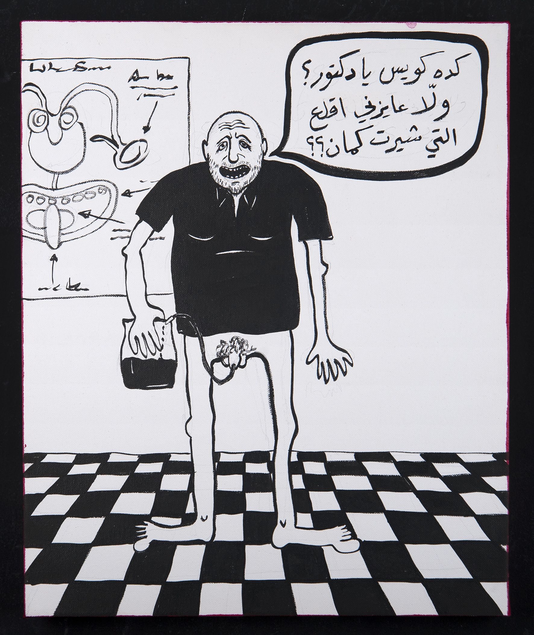 Published August 18, 2016 at 1772 × 2107 in RGB (1) “Is this alright, Doctor, or do you want me to take my shirt off as well?” India ink and acrylic paint on canvas 55 cm X 45 cm
