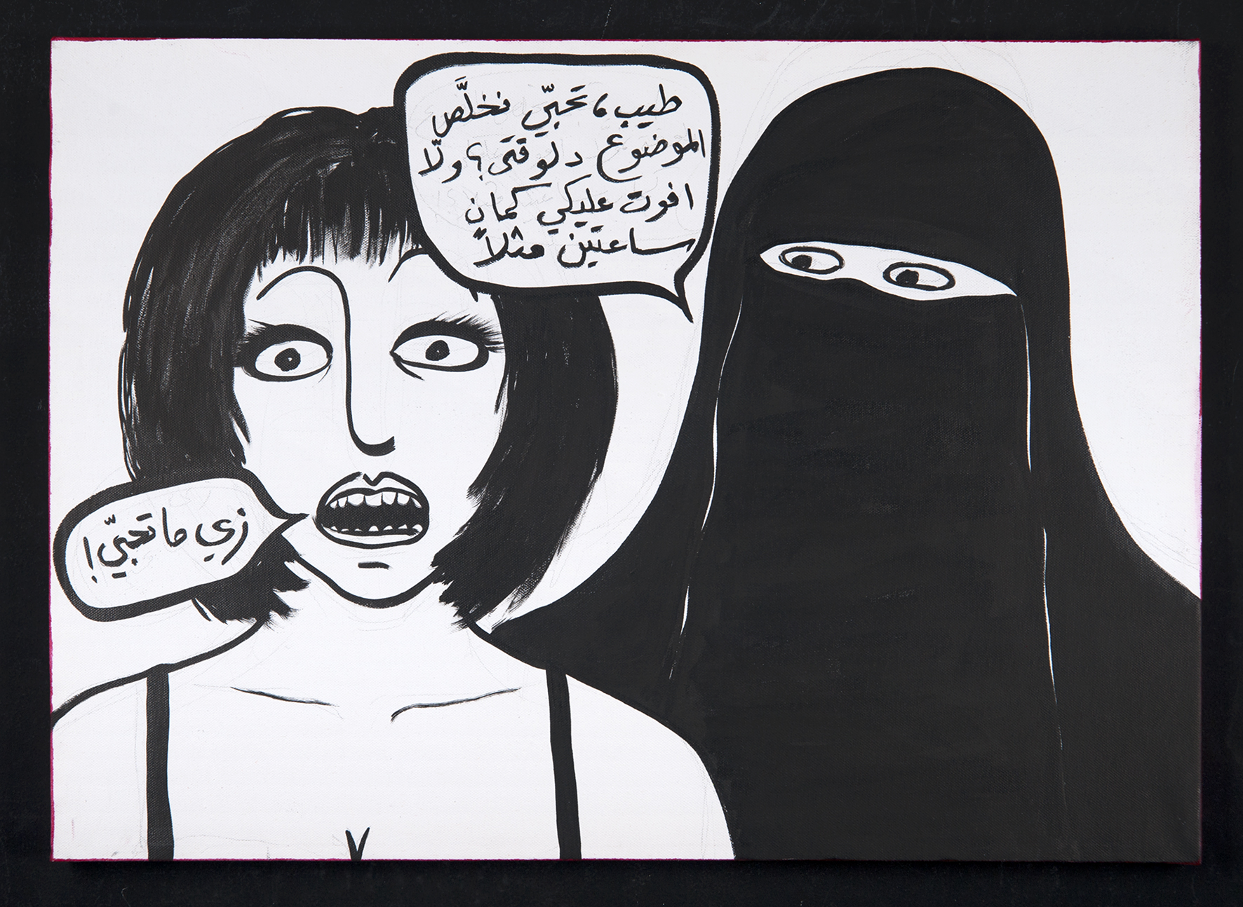 Published August 18, 2016 at 1772 × 1294 in RGB (1) – Woman (right): “Shall we do it now, or do you want me to come back in two hours or something?” – Woman (left): “Whatever works for you!” India ink and acrylic paint on canvas 70 cm X 50 cm