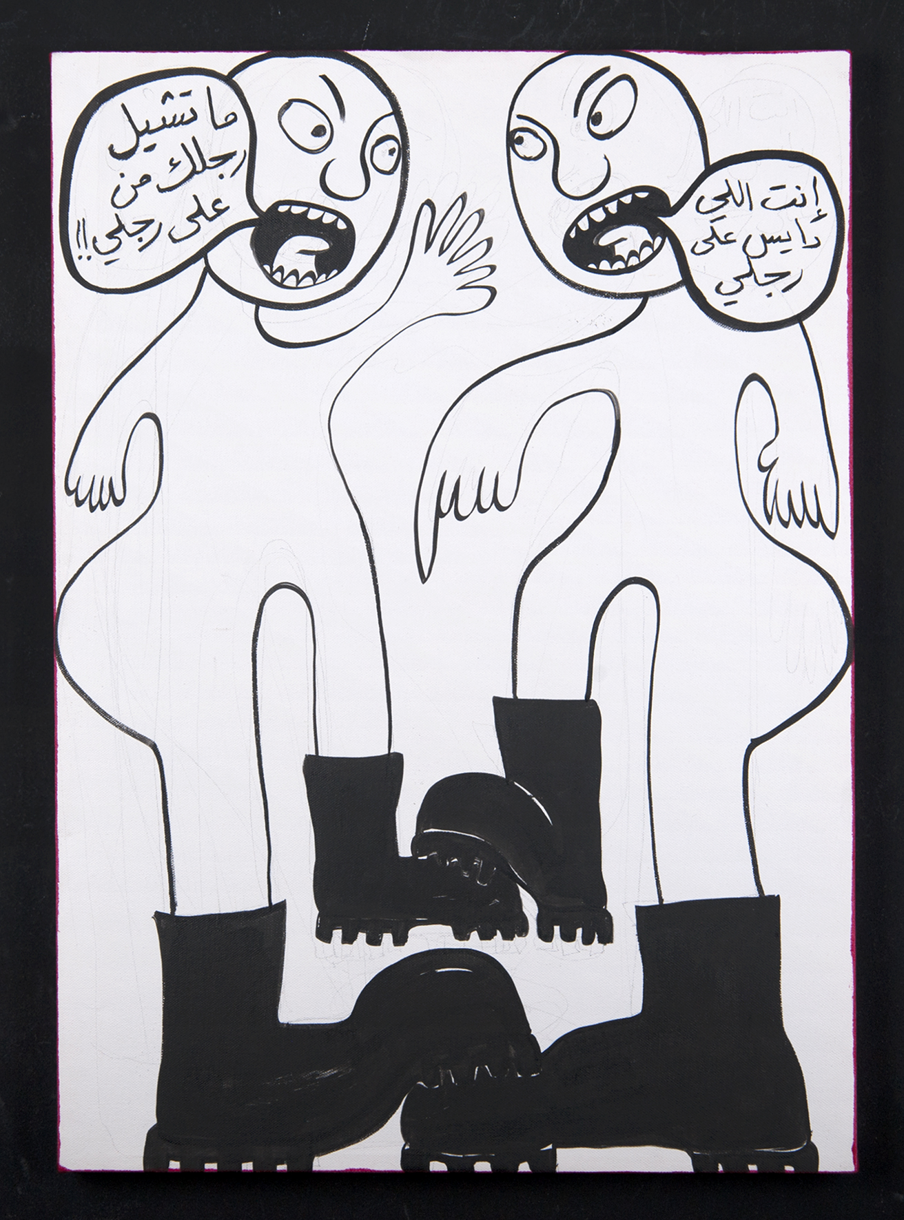 Published August 18, 2016 at 1312 × 1772 in RGB (1) – Person (left): “Don’t step on my foot!” – Person (right): “You’re the one stepping on my foot!” India ink and acrylic paint on canvas 70 cm X 50 cm