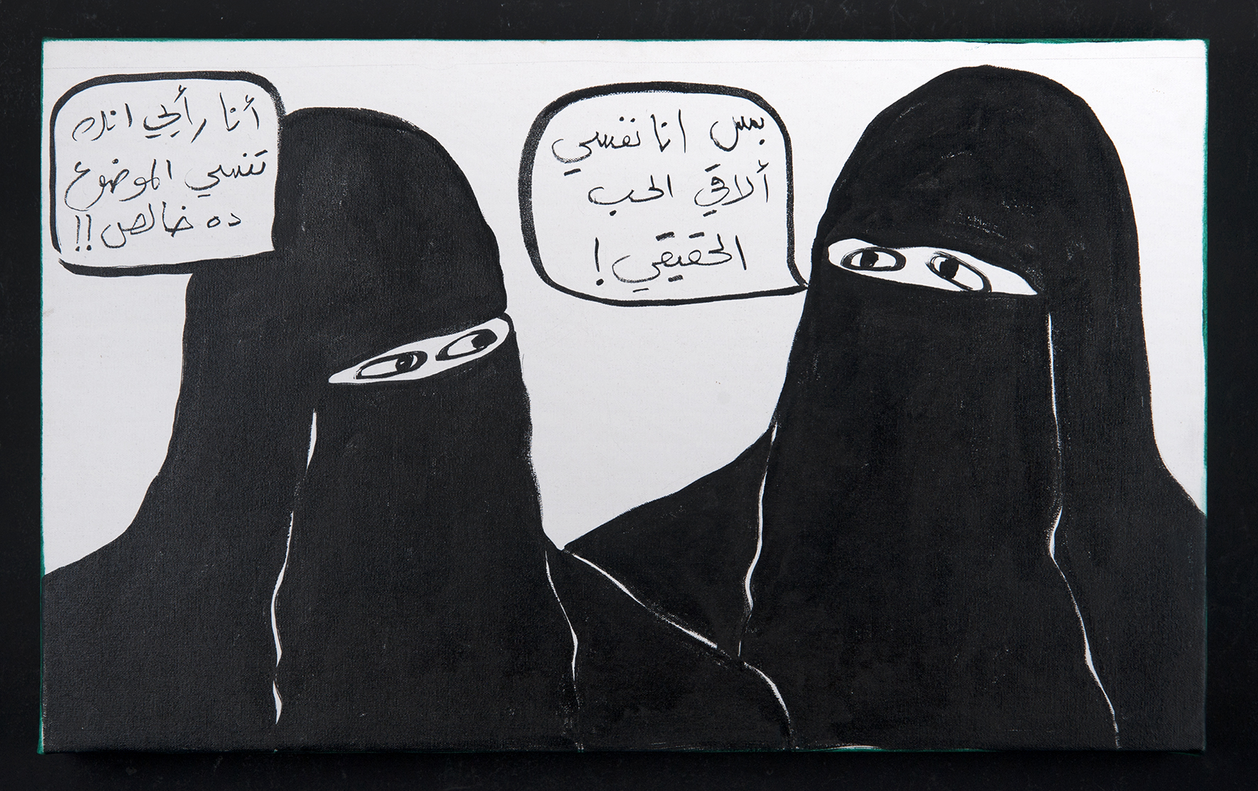 Published August 18, 2016 at 1772 × 1114 in RGB (1) – Woman (left): “I suggest you forget about the whole thing.” – Woman (right): “But I really want to find true love!” India ink and acrylic paint on canvas 72 cm X 45 cm