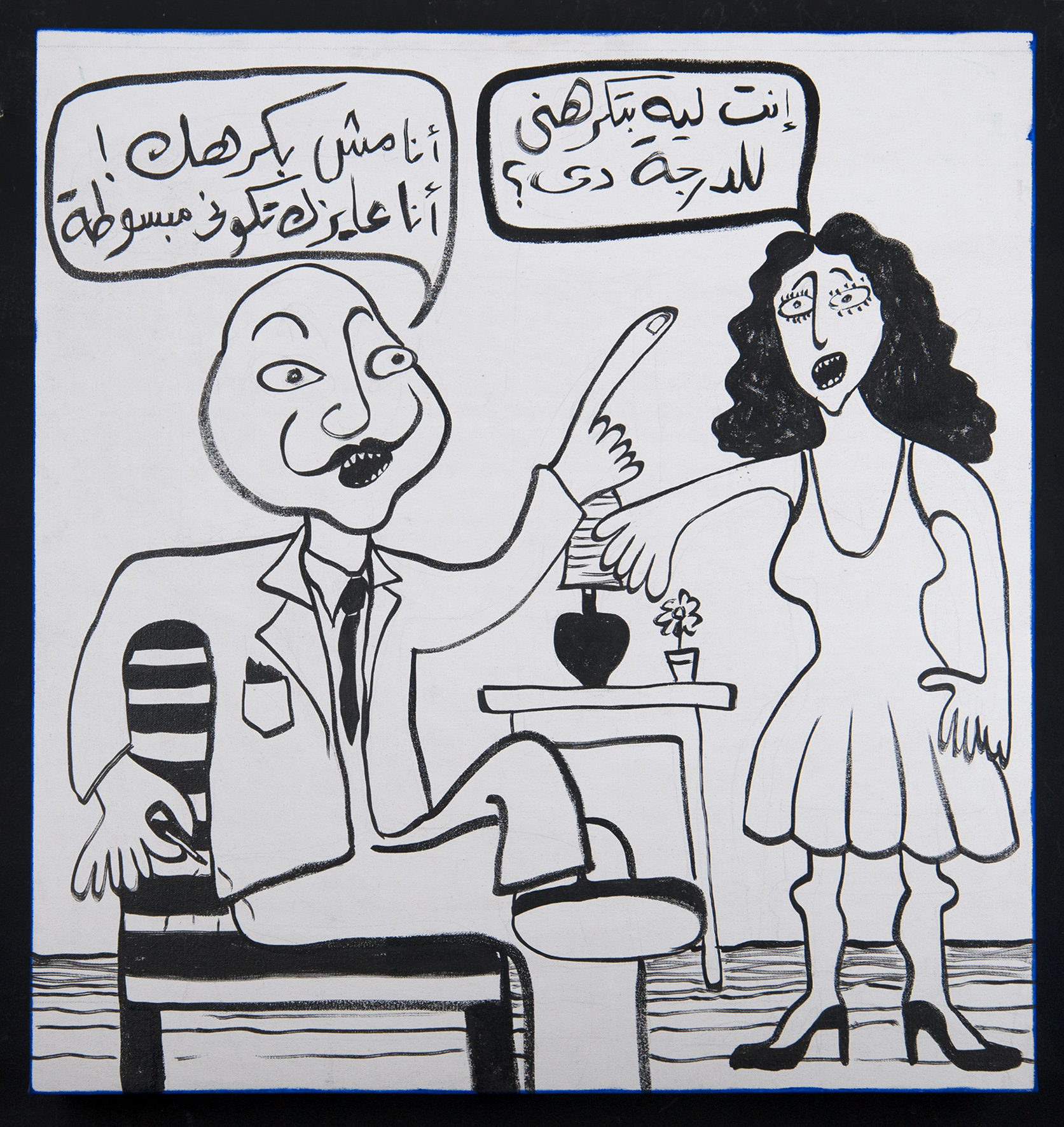 Published August 18, 2016 at 1673 × 1772 in RGB (1) – Woman: “Why do you hate me so much?!” – Man: “I don’t hate you! I want you to be happy!” India ink and acrylic paint on canvas 70 cm X 65 cm