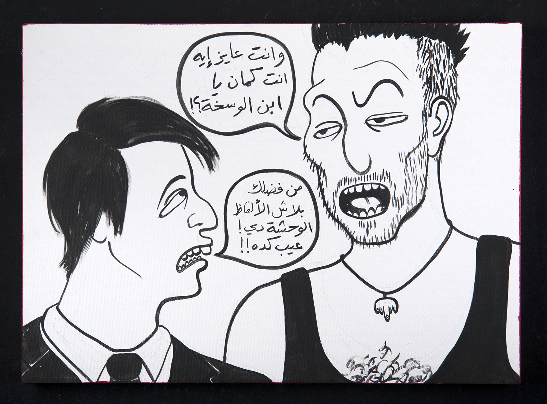 Published August 18, 2016 at 1772 × 1309 in RGB (1) – Man (right): “What the fuck do you want, motherfucker?!” – Man (left): “Please don’t use such vulgar language! It’s inappropriate!” India ink and acrylic paint on canvas 70 cm X 50 cm